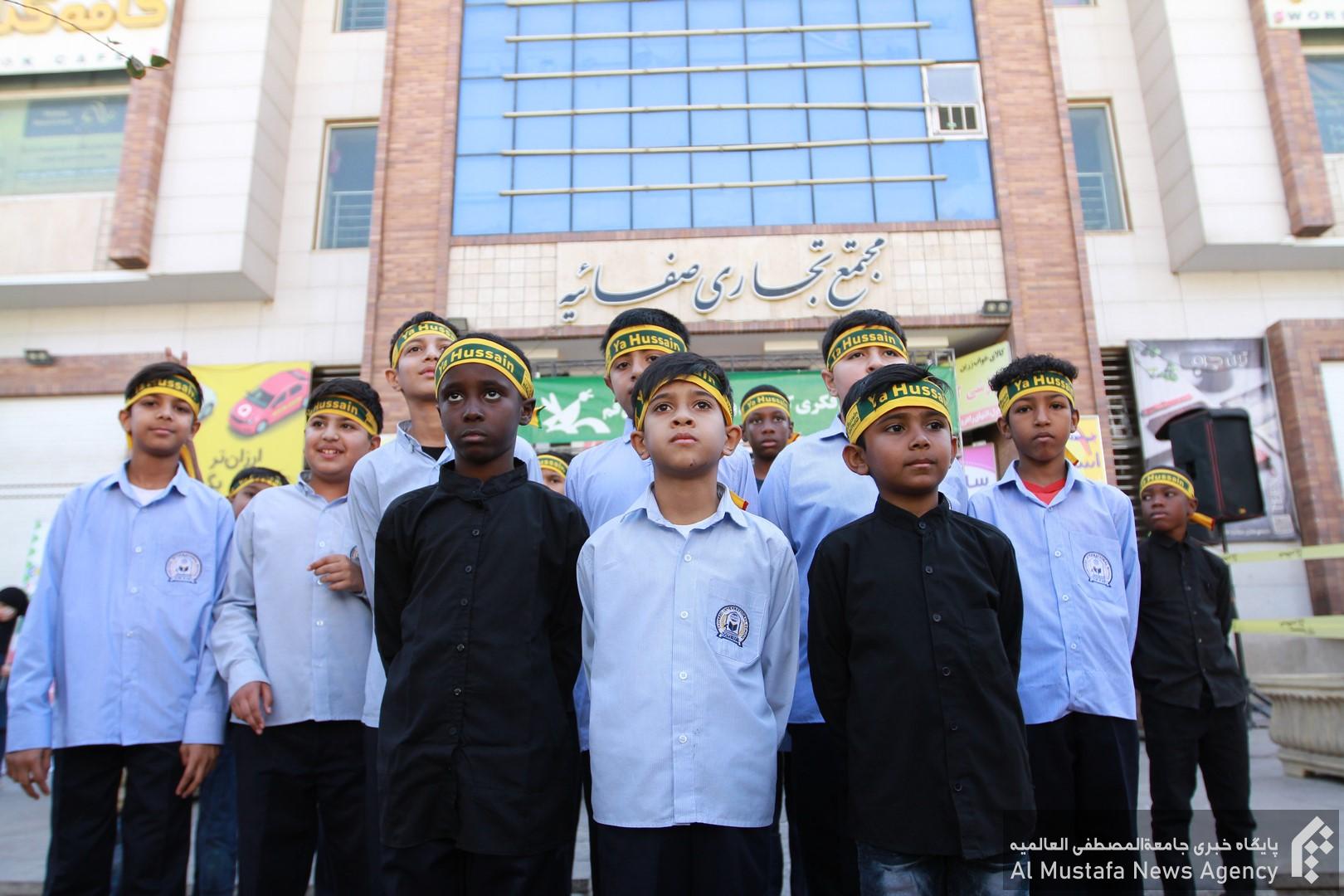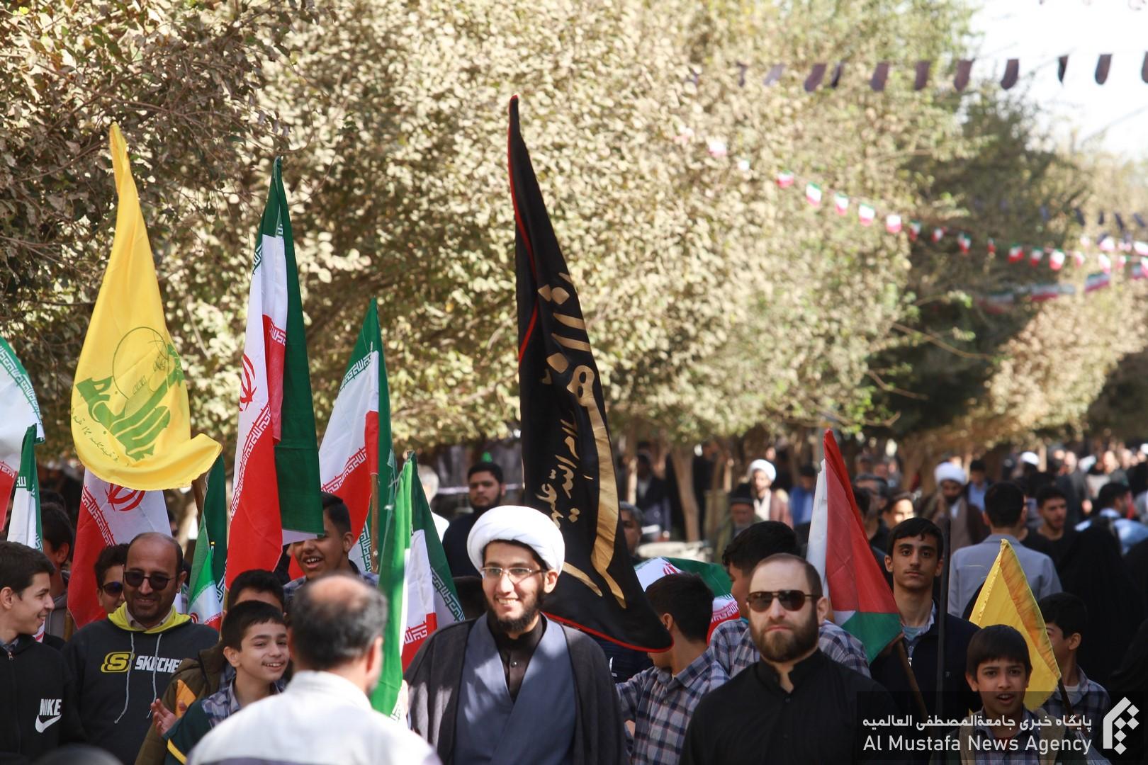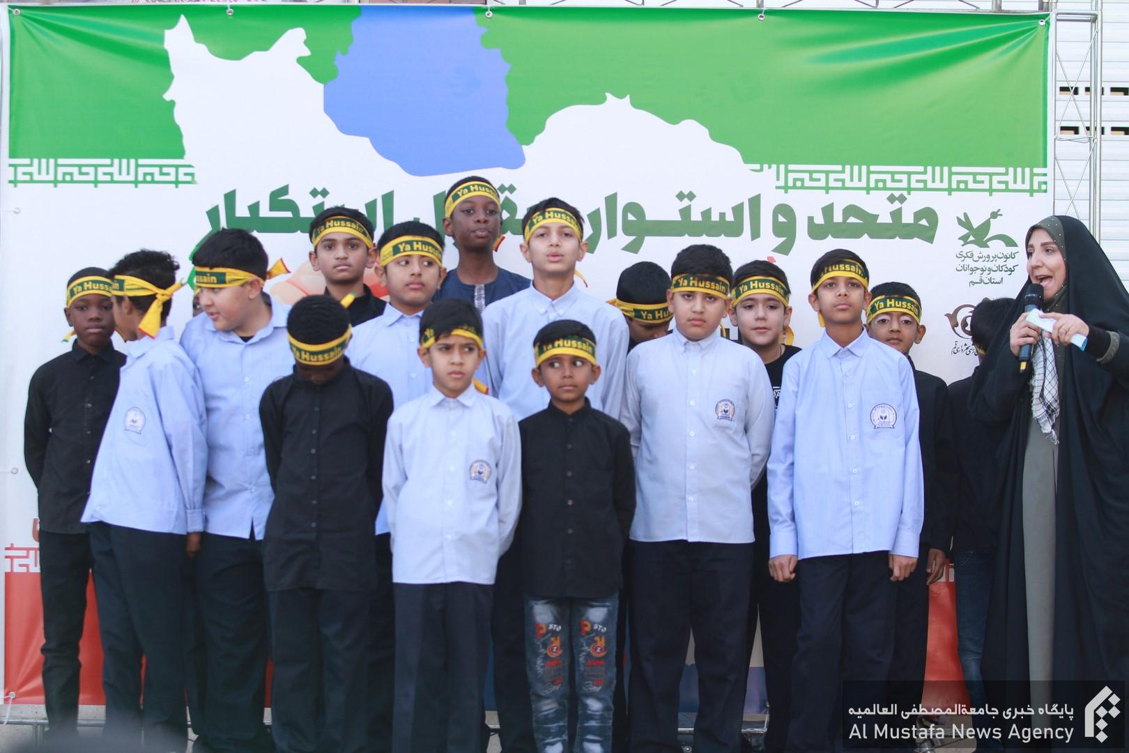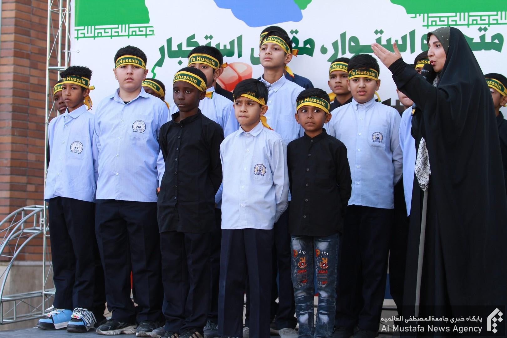 اجرای سرود توسط فرزندان طلاب المصطفی به زبان های فارسی، عربی و انگلیسی از جلوههای ماندگار در این راهپیمایی دشمن شکن بود.