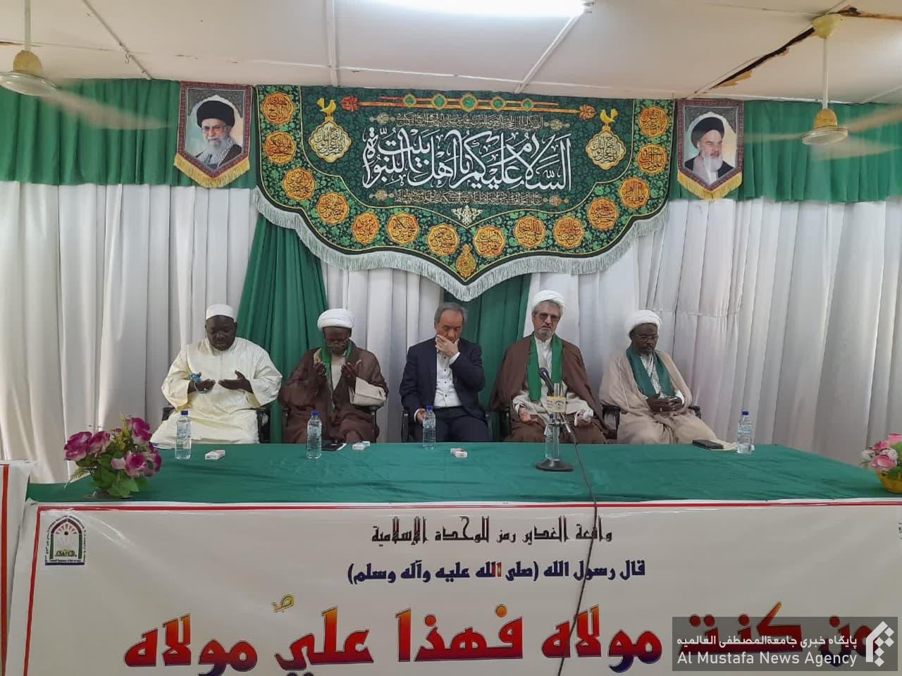 در این مراسم حجت الاسلام والمسلمین حداد معاون منطقه جامعةالمصطفی و چند نفر از شیوخ تیجانیه و اساتید به زبان های عربی، فرانسوی و زبان محلی موری درباره واقعه غدیر به سخنرانی پرداختند.