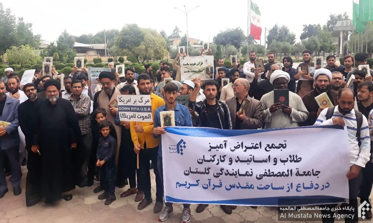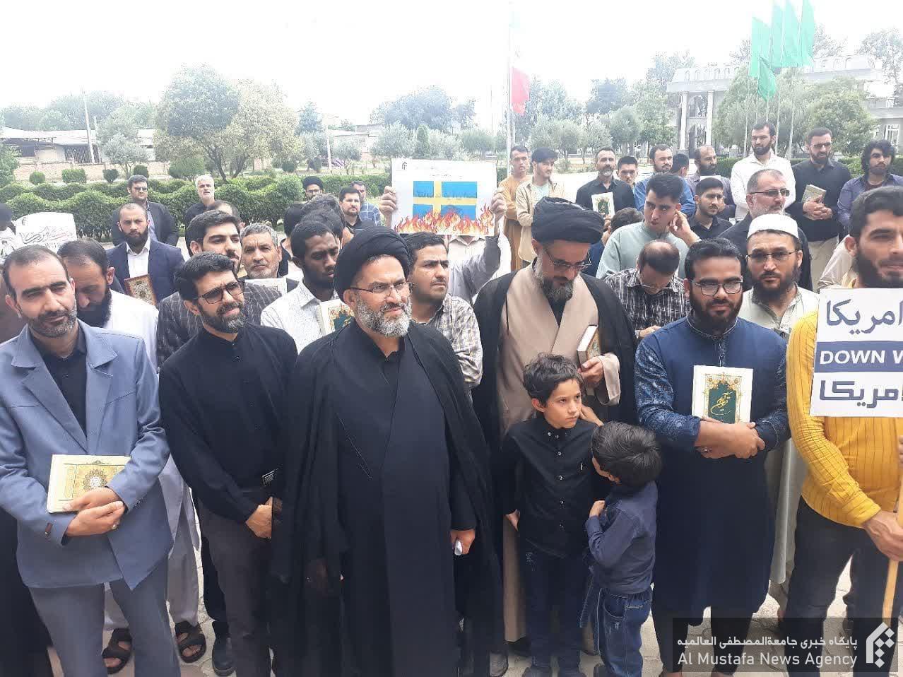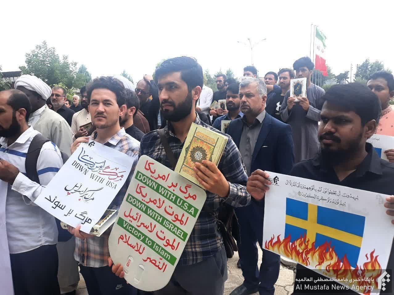 شرکت کنندگان در این تجمع با در دست داشتن مصحف شریف، ضمن محکوم نمودن اهانت به قرآن کریم در کشورهای سوئد و دانمارک، حمایت خود را از کتاب مقدس آسمانی و انزجار خود را از عاملان و حامیان این حرکت شنیع اعلام نمودند.