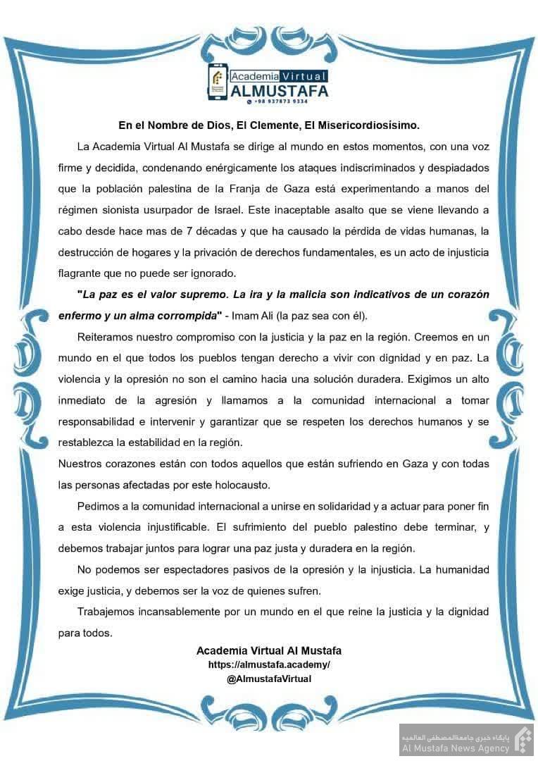 بیانیه آکادمی المصطفی در ونزوئلا در محکومیت جنایت رژیم صهیونیستی در بمباران بیمارستان المعمدانی غزه بدین شرح است