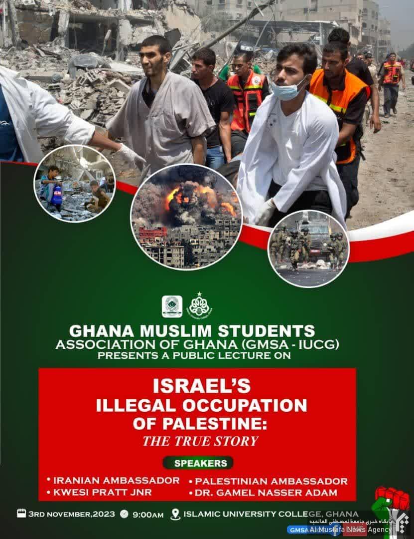 نمایندگی جامعةالمصطفی در کشور غنا نیز ضمن برگزاری نمایشگاهی تحت عنوان «نمایشگاه عکس ۷۵ سال جنایت صهیونیستها»، همایش حمایت از مردم مظلوم فلسطین را در دانشگاه اسلامی غنا برگزار نمود.