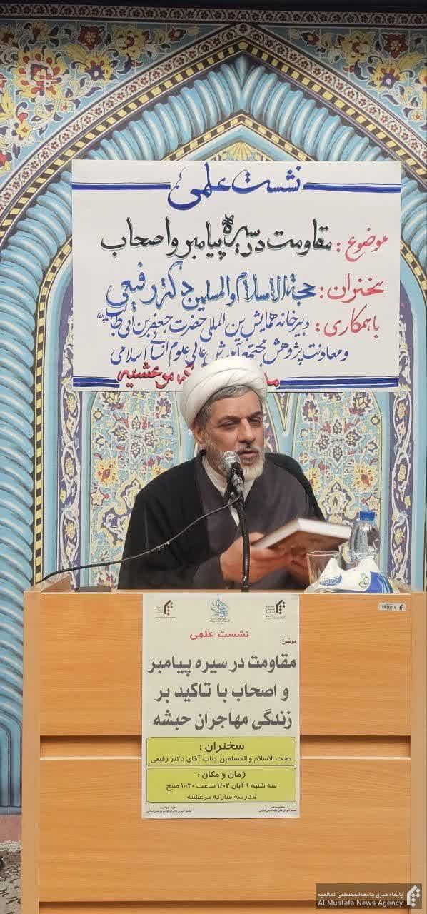 حجتالاسلاموالمسلمین رفیعی؛ بهعنوان سخنران اصلی نشست با تأکید بر زندگی مهاجران حبشه، مقاومت پیامبر و اصحاب را تشریح کردند.