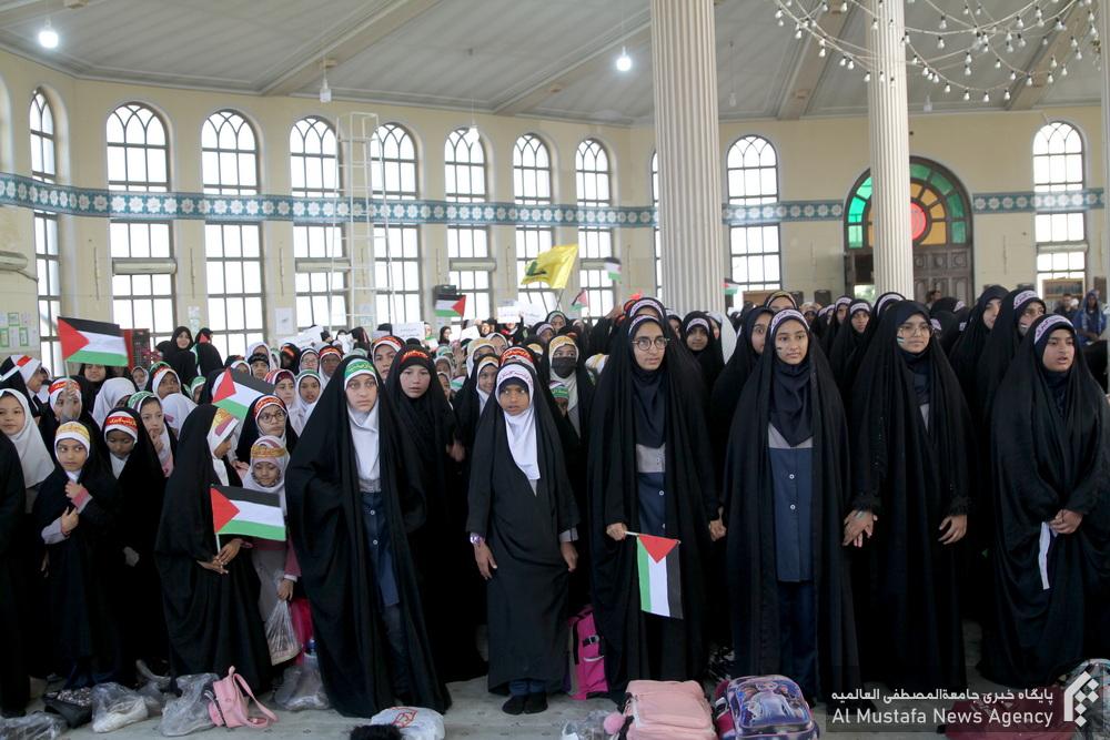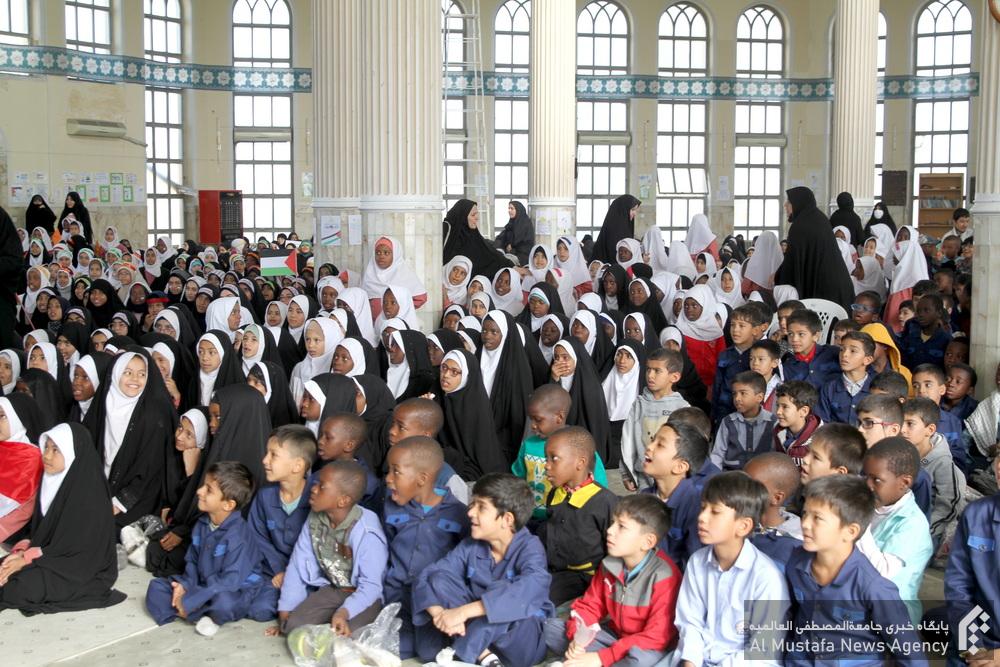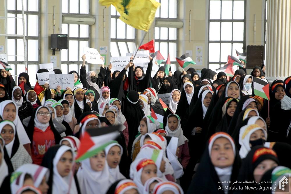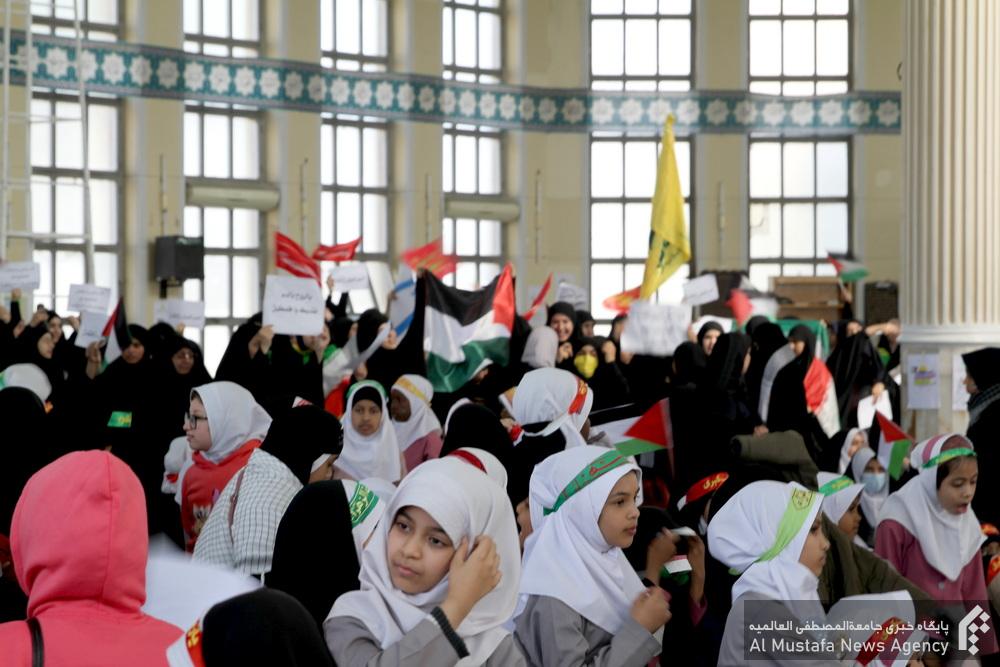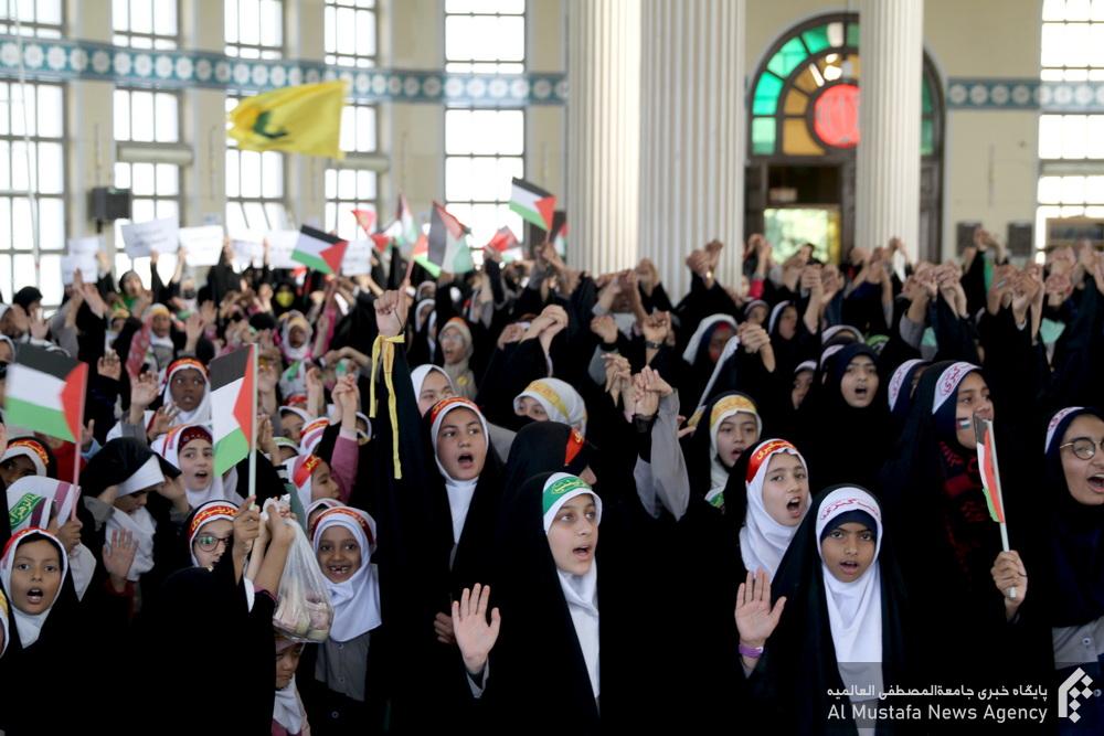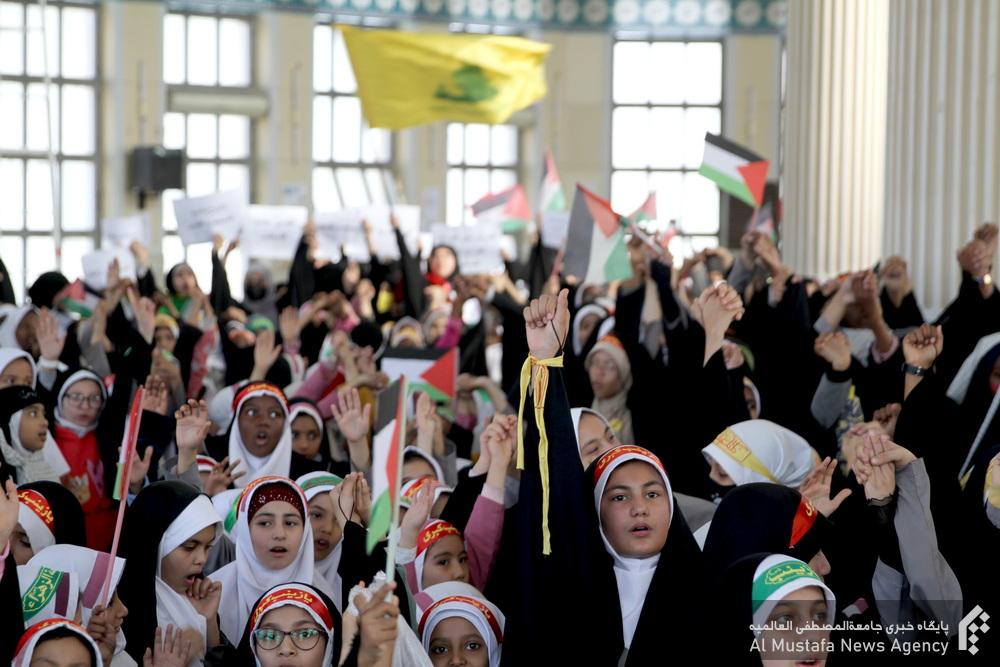 فرزندان جامعةالمصطفی از بیش از ۱۰۰ کشور جهان که در مدارس جامعةالمصطفی مشغول تحصیل هستند، گرد هم جمع شدند تا انزجار خود را از رژِیم صهیونیستی جنایتکار و استکبار جهانی اعلام و از مردم مظلوم غزه و فلسطین حمایت نمایند.