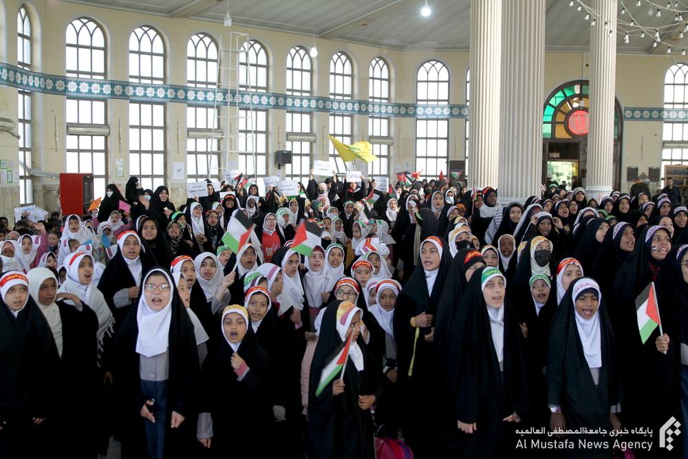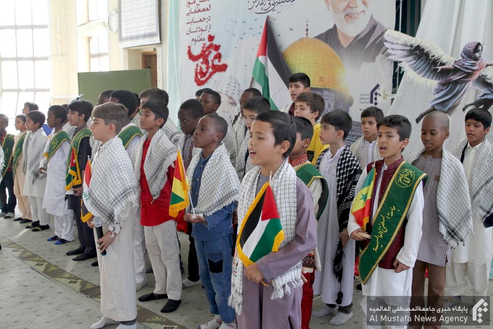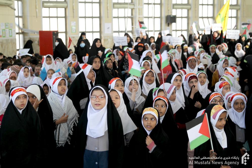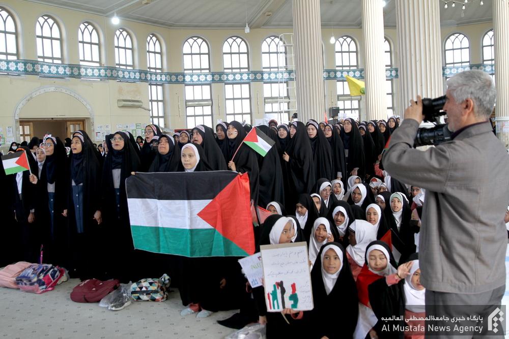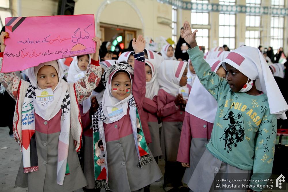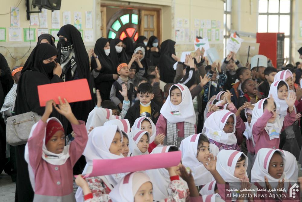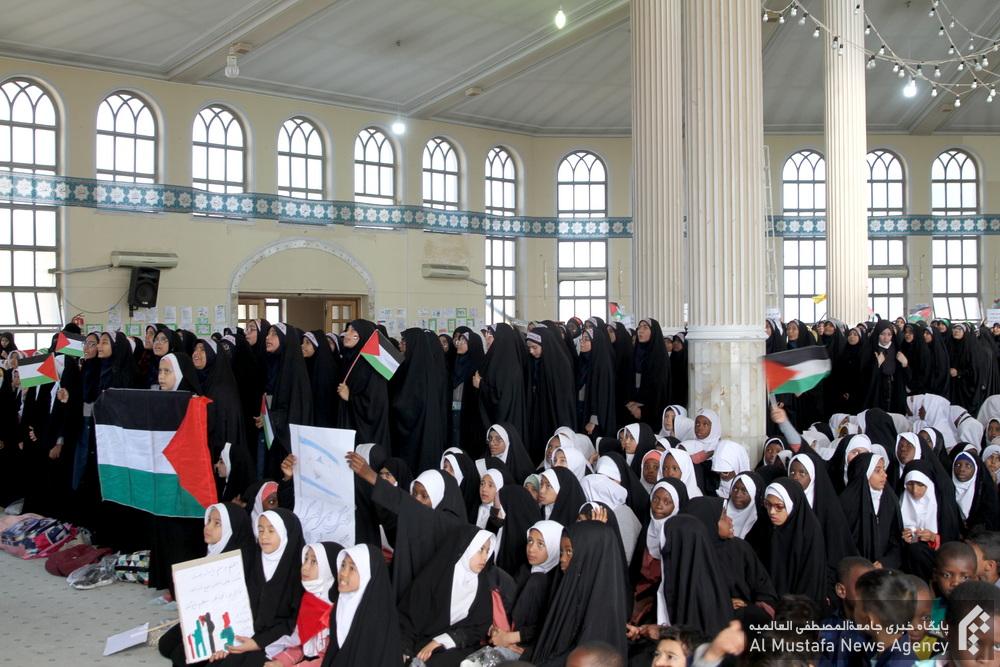 فرزندان جامعةالمصطفی از بیش از ۱۰۰ کشور جهان که در مدارس جامعةالمصطفی مشغول تحصیل هستند، گرد هم جمع شدند تا انزجار خود را از رژِیم صهیونیستی جنایتکار و استکبار جهانی اعلام و از مردم مظلوم غزه و فلسطین حمایت نمایند.