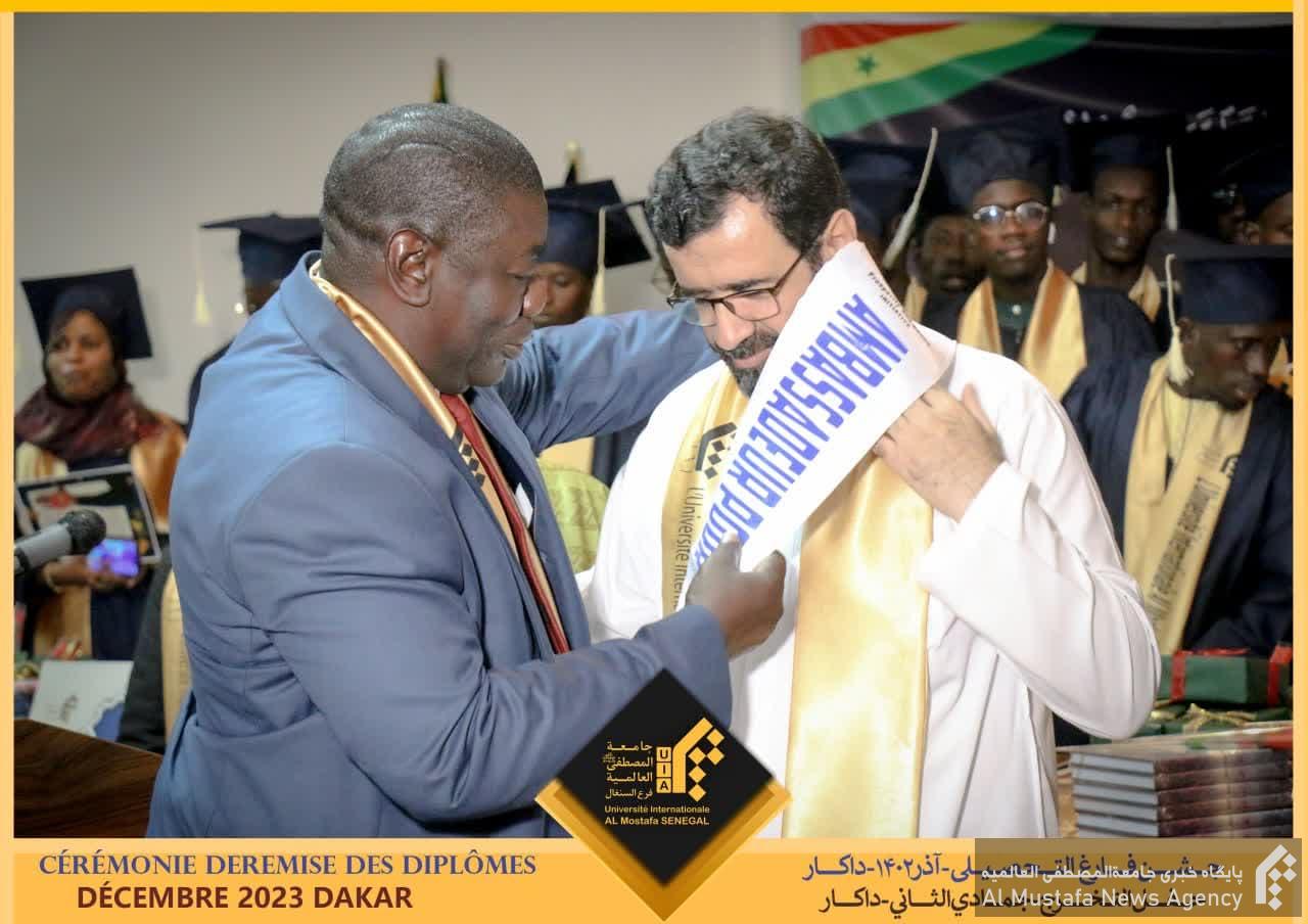 وی همچنین از آقای “شيخ تيجان امباي” رييس كميته ابتكار صلح و سعادت شعبه سنگال و “مهندس عبدو امبومب” مشاور رئیس جمهور که به نمایندگی از دولت سنگال در جشن دانشآموختگی المصطفی حضور یافته بود، دعوت کرد تا لوح و نشان حمایل سفیر صلح را به نماینده منطقهای جامعة المصطفی اهدا نمایند.