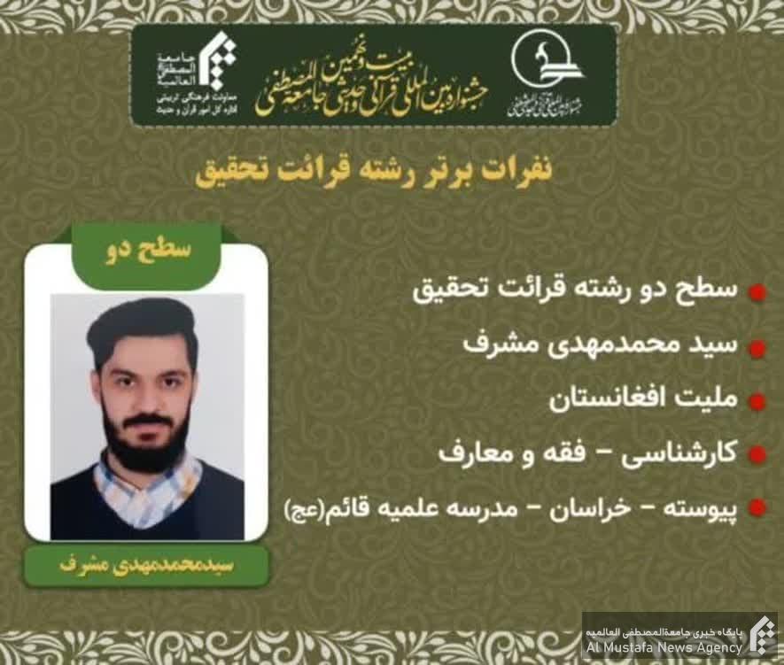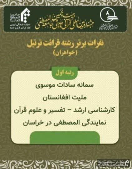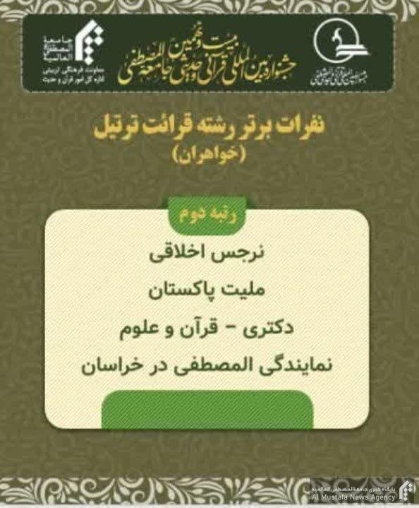 همچنین خانمها سمانه موسوی و نرجس اخلاقی طلاب مجتمع آموزش عالی خواهران المصطفی خراسان از کشورهای افغانستان و پاکستان در رشته ترتیل به ترتیب موفق به کسب رتبه های اول و دوم شدند.