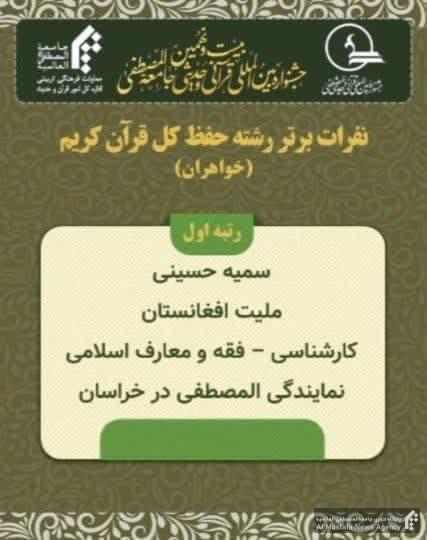 در این دوره از مسابقات خانم سمیه حسینی طلبه مجتمع آموزش عالی خواهران المصطفی خراسان از کشور افغانستان در رشته حفظ کل قرآن کریم حائز رتبه اول شد.