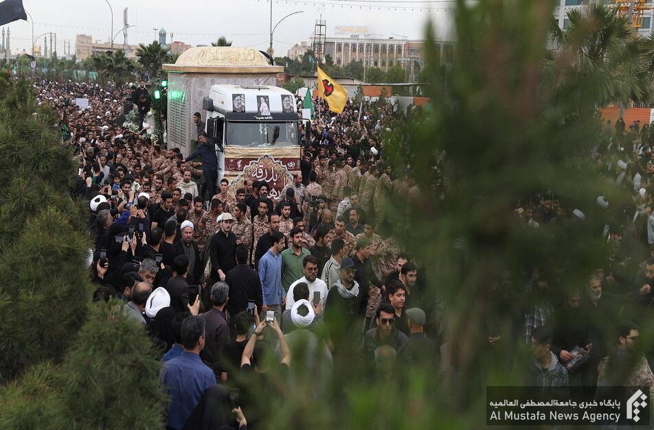 اهالی دیار کریمه اهل بیت(س) و خاستگاه انقلاب اسلامی از مرد و زن، پیر و جوان و کودک و نوجوان خود را به بلوار پیامبر اعظم(ص) رسانده اند تا پیکرهای مطهر شهدایی را تشییع کنند که جان عزیز و همه هستیشان را برای خدمت و رفاه و آسایش و آرامش ایران و ایرانی فدا کردند.