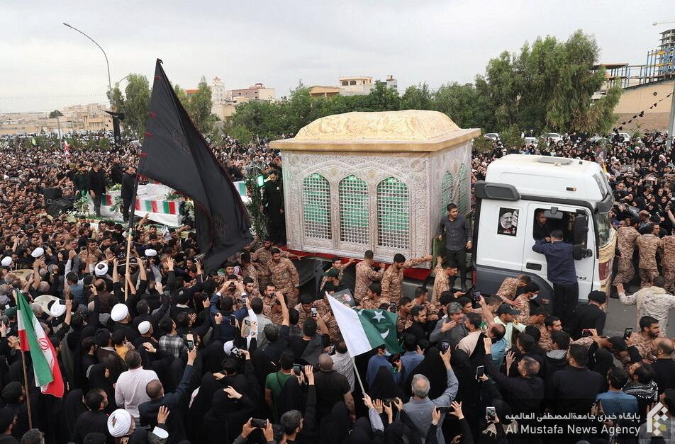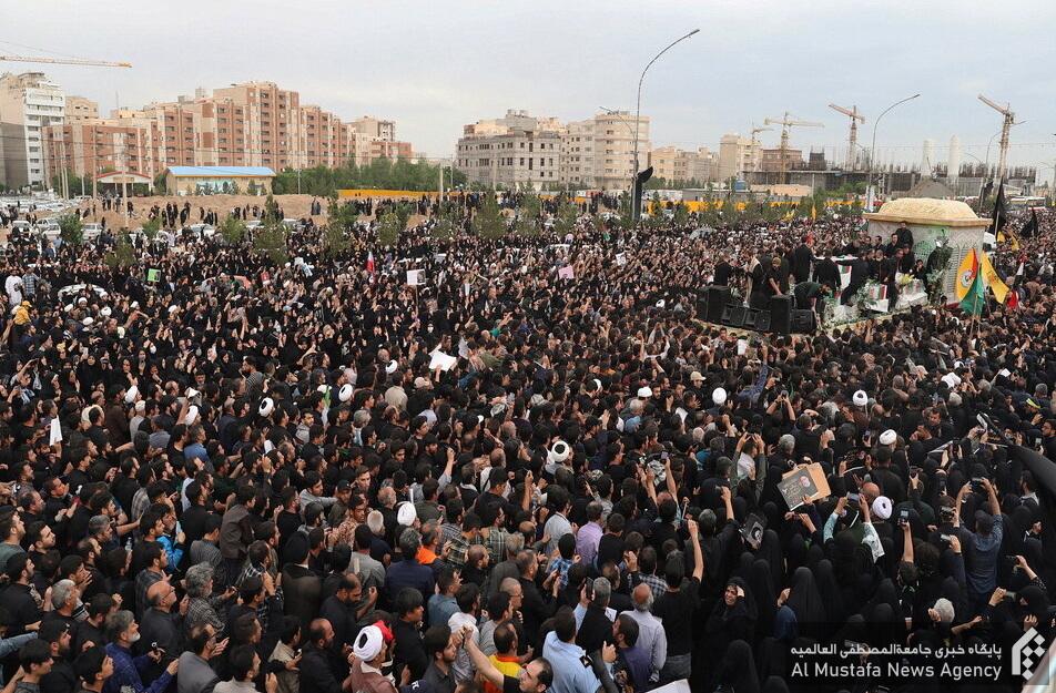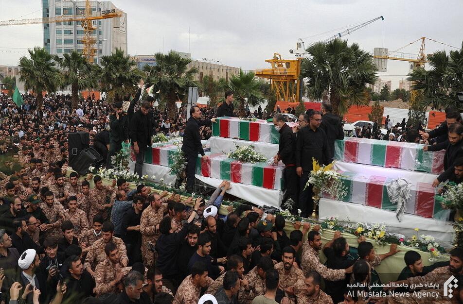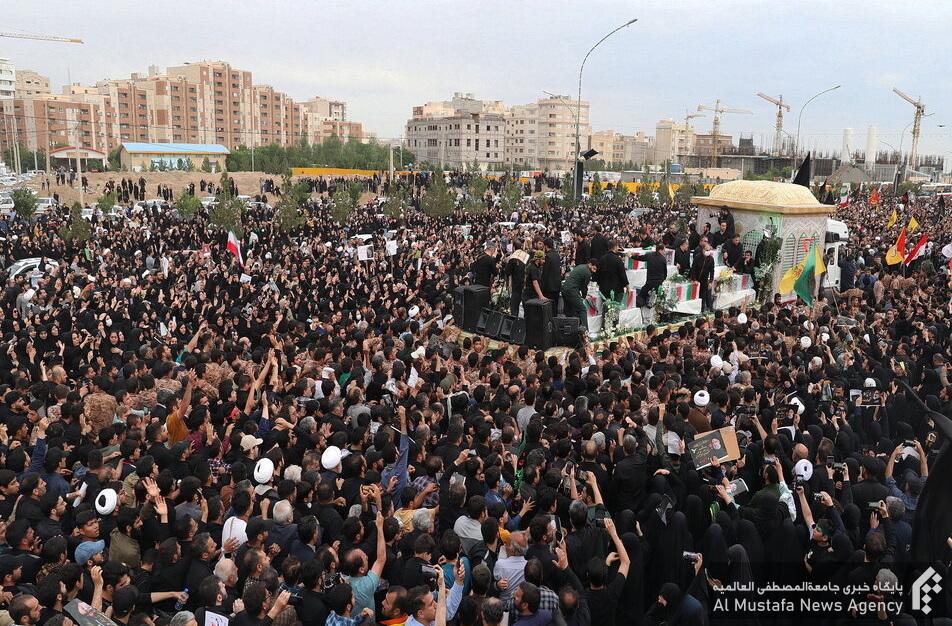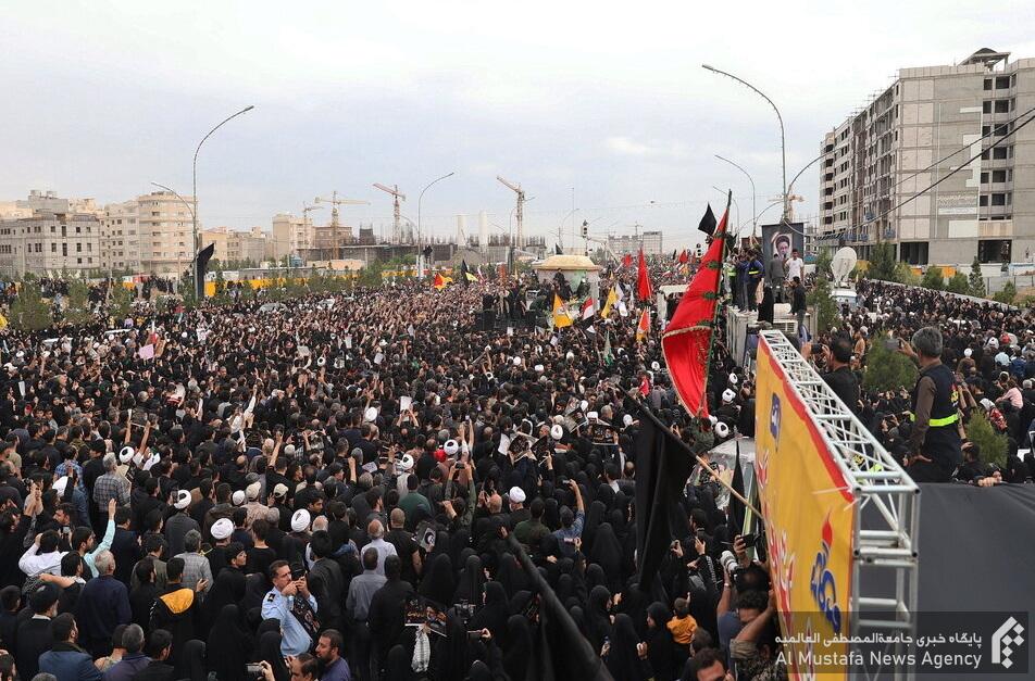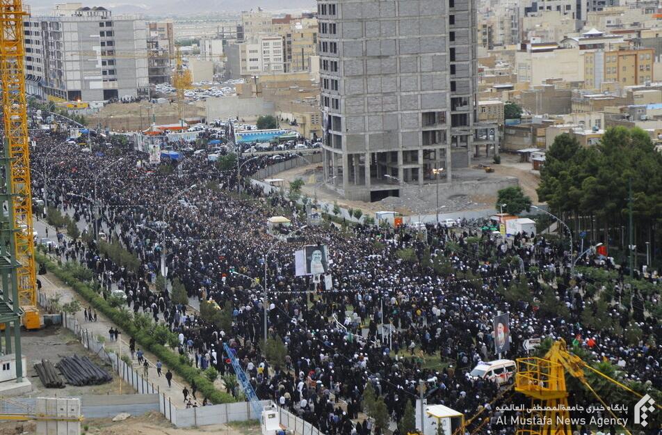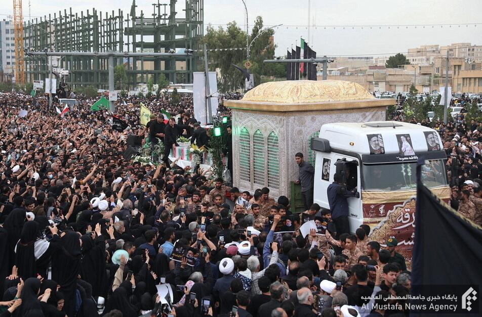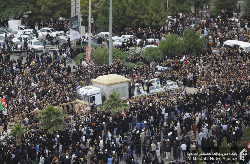 خیابان های منتهی به مسیر تشییع شهدای خدمت مملو از جمعیت عزاداری بود که با چشمانی اشکبار برای قدردانی از سیدمحرومان و یاران عزیزش به میدان آمده اند و شعار سر میدهند «رئیسی رئیسی شهادتت مبارک»، «ای یاور محرومان تشکر تشکر»، «لبیک یا حسین (ع)» و …