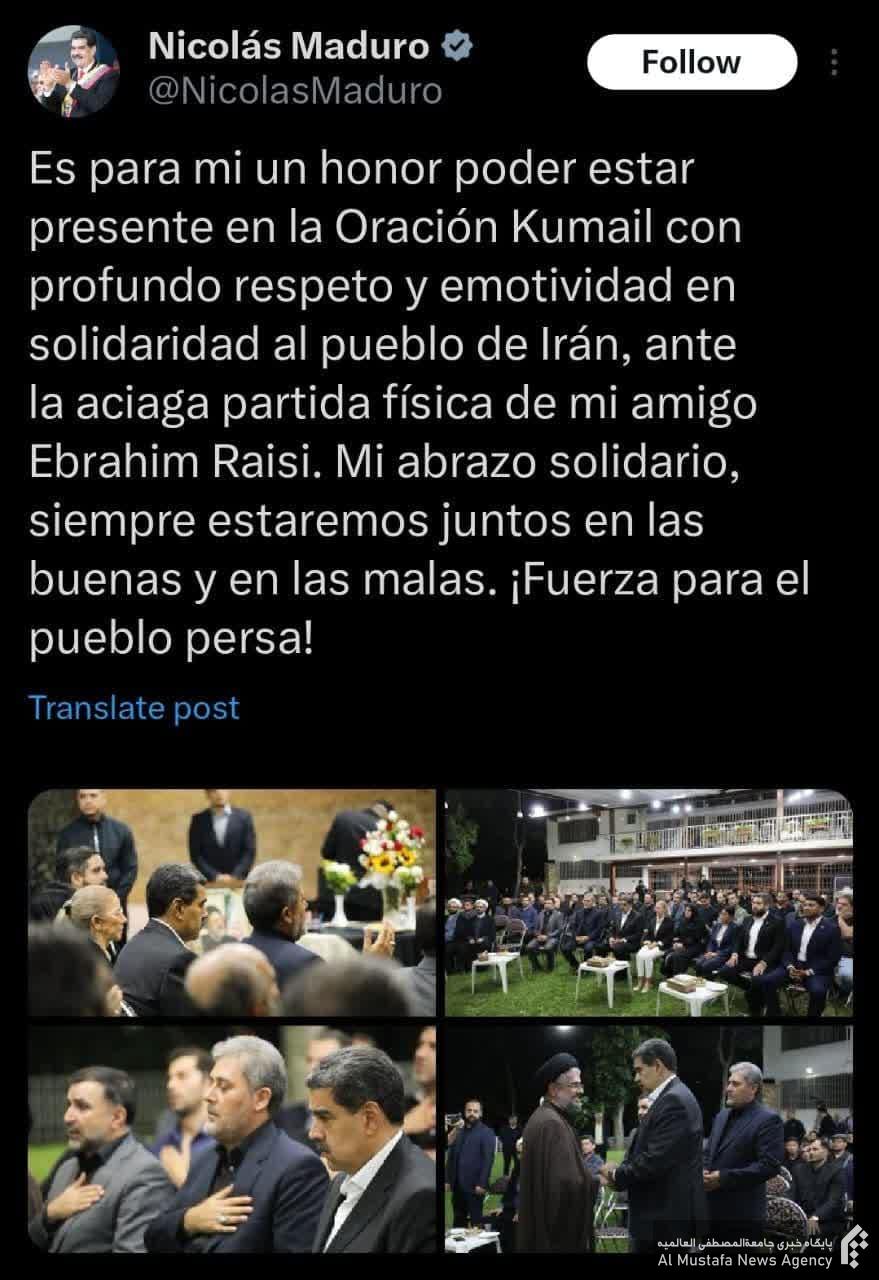 نیکلاس مادور رئیس جمهور ونزوئلا در مراسم ختم شهید رئیسی و شهید امير عبداللهیان که در اقامتگاه سفیر جمهوری اسلامی ایران برگزار شده بود، شرکت کرد.