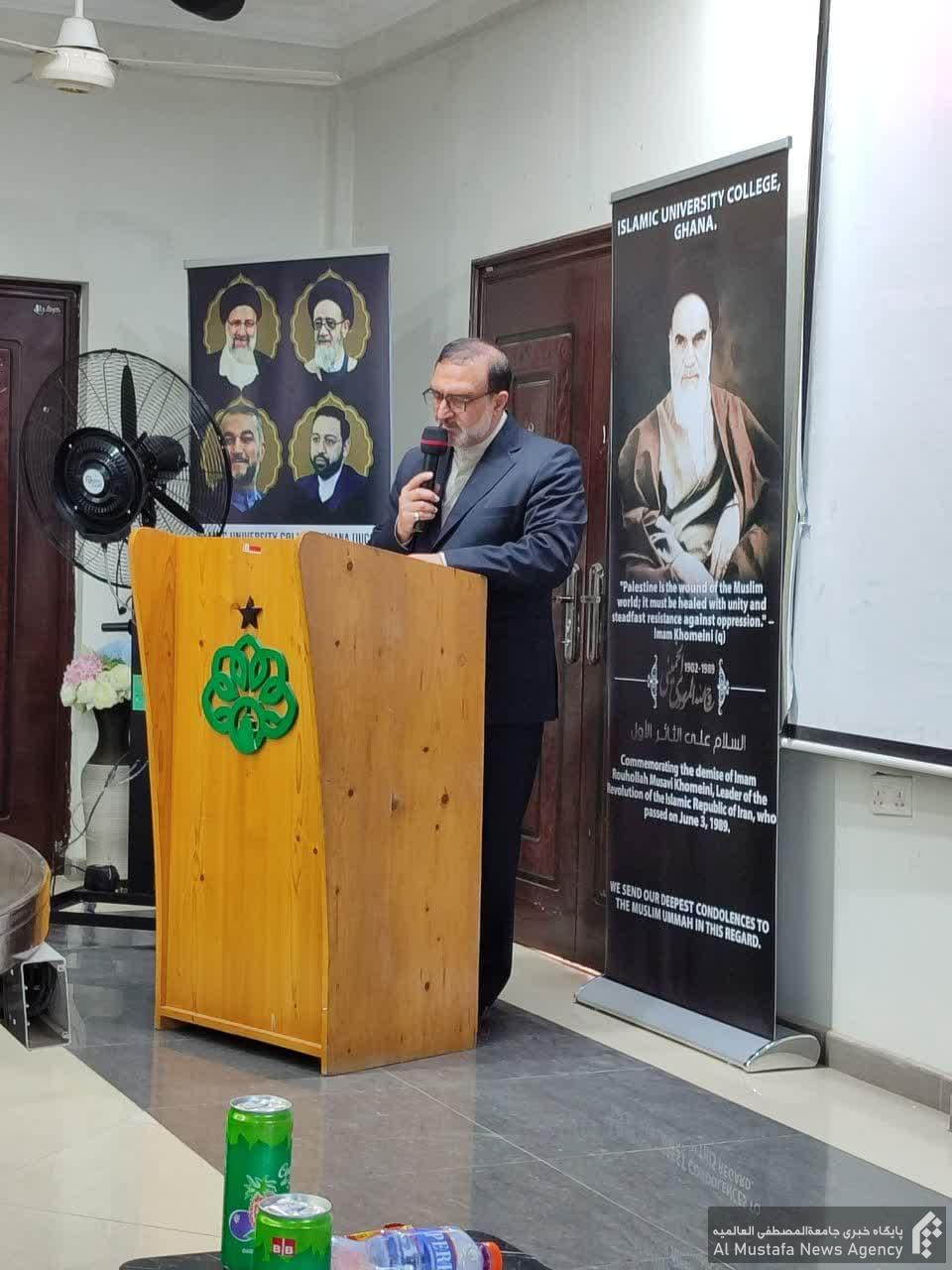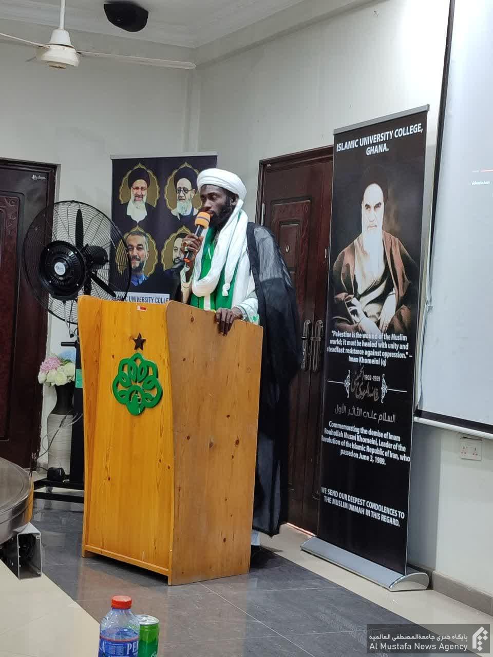 سخنرانان این مراسم دکتر هادی کمال عزت رئیس دانشگاه اسلامی غنا؛ گرامی سفیر ایران در غنا و نیز شیخ کمال الدین امام شیعیان غنا طی سخنانی به نقش امام خمینی(ره) در وحدت اسلامی و پدیداری مقاومت جهانی در برابر استکبار جهانی اشاره نمودند.