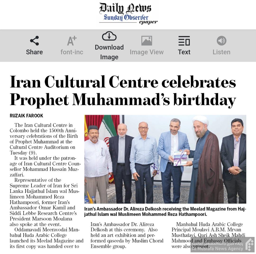 در این مراسم که با حضور برخی از فارغ التحصیلان المصطفی و صاحب نظران سریلانکایی و حجت الاسلام والمسلمین محمد رضا حاتم پوری نماینده محترم دفتر مقام معظم رهبری و آقای دکتر دلخوش سفیر محترم جمهوری اسلامی ایران در کلمبو و سایر ایرانیان مقیم ، به میزبانی سرپرست محترم رایزنی فرهنگی از مجله میلاد النبی (ص) به زبان سینهالی که زحمات اساتید محترم و همکاران گرامی نمایندگی جامعة المصطفی می باشد،رونمایی شد.