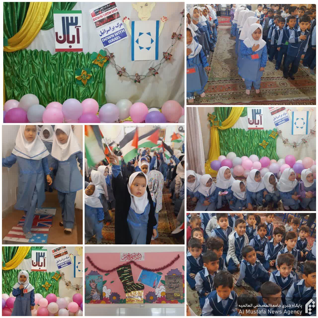 این مراسم باهمخوانی سرود نسل آرمانی همراه برافراشتن پرچم فلسطین،داستان گویی شهید فهمیده،یادکردن از شهدا وفاتحه خوانی،شعرخوانی ،اجرای بازی و سرگرمی،اجرای مسابقه ،بیان کودکانه جنایت های آمریکا و سر دادن شعار ادامه یافت .
