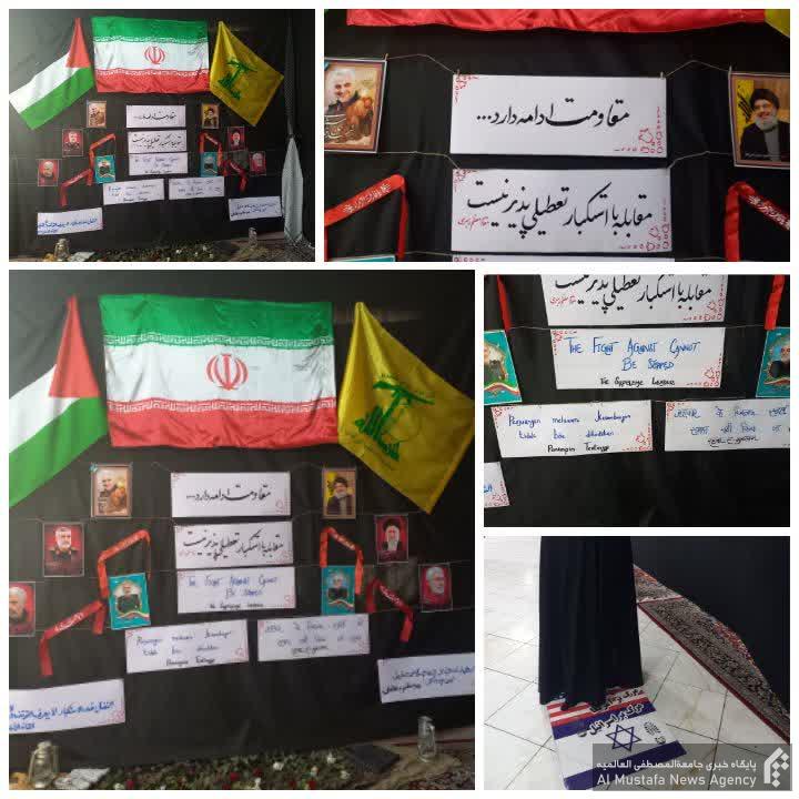 در این نمایشگاه، طلاب از ملیتهای مختلف، سخن مقام معظم رهبری حفظهالله با موضوع «مبارزه با استکبار تعطیلپذیر نیست» را به زبانهای مختلف ترجمه و خطاطی کردند.