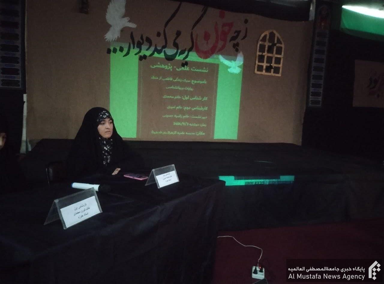 در ادامه خانم فاطمه موسوی درباره «نقش زنان فاطمی از خانه تا جامعه» سخن گفت. وی با اشاره به نقش تربیتی حضرت زهرا(س)، توضیح داد که آن حضرت با پرورش شخصیتهایی چون امام حسین(ع) و حضرت زینب(س)، از درون خانواده به پاسداری از اسلام پرداختند و نقش بنیادینی در تداوم پیام دین ایفا کردند.