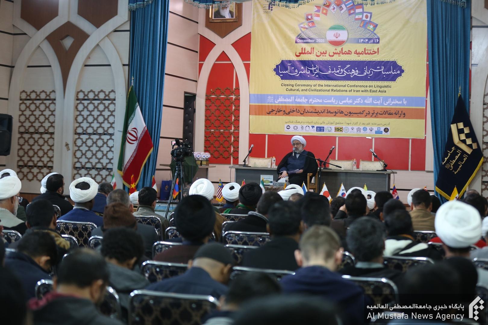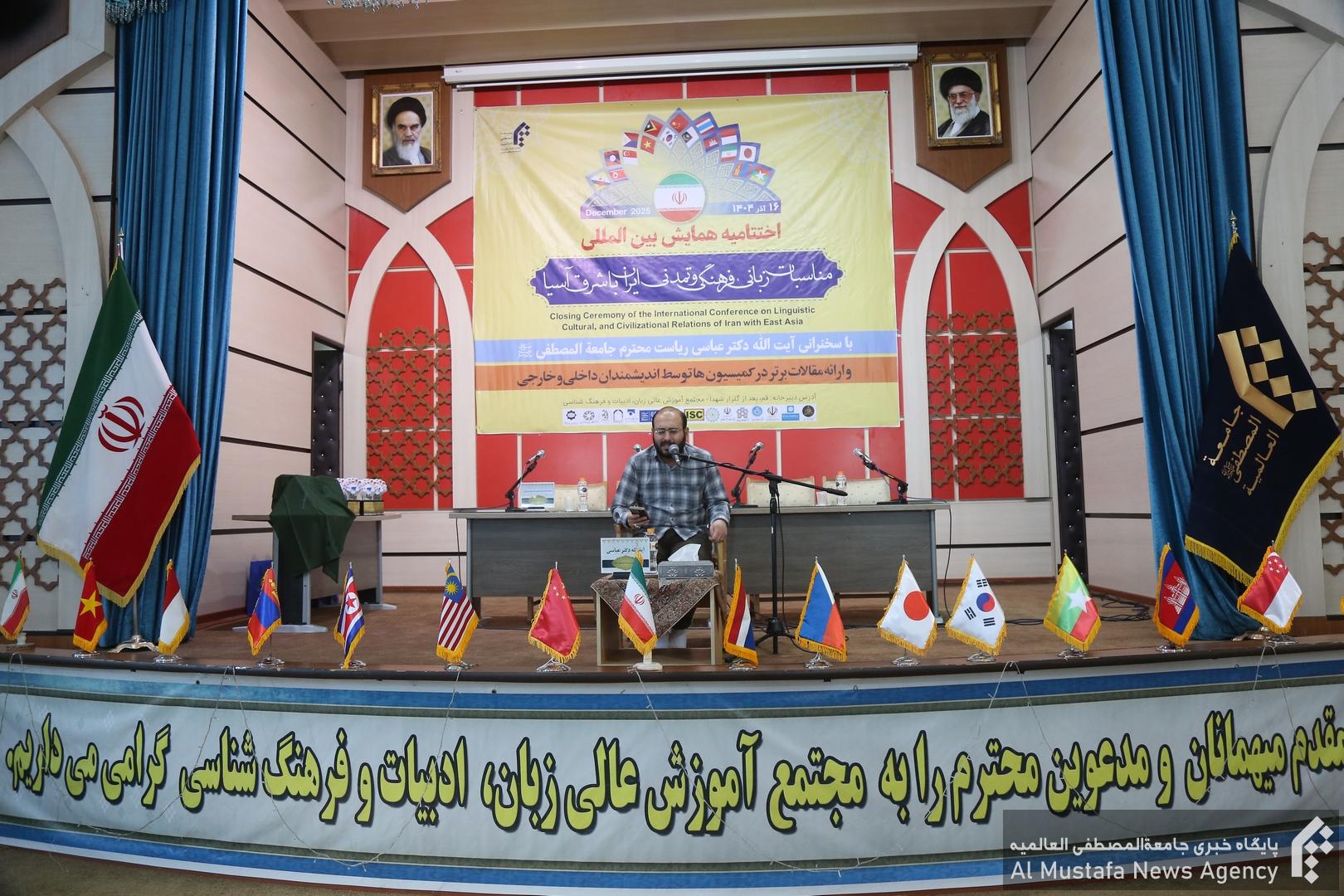 حجت الاسلام والمسلمین مطهری در آیین اختتامیه به ارائه گزارشی از همایش بین المللی مناسبات زبانی، فرهنگی و تمدنی ایران با شرق آسیا پرداخت.