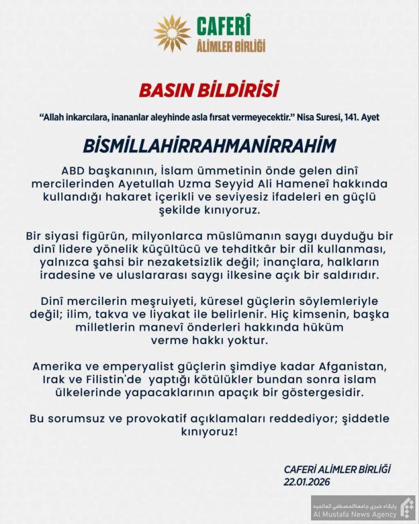 اتحادیه علمای زینبیه (جابر) ضمن محکومکردن هرگونه تهدید، مداخله و سیاستهای خصمانه علیه جمهوری اسلامی ایران، بر ضرورت وحدت علما، نخبگان و ملتهای مسلمان در برابر پروژههای تفرقهافکنانه دشمنان اسلام تأکید کرده و همبستگی کامل خود را با ملت ایران اعلام داشته است.
