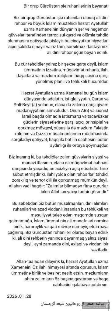 ما، جمعی از علمای شیعه گرجستان، تهدیدهای ترور، توطئه و قتل از سوی نیروهای شرور و سلطهطلب جهانی را بهشدت محکوم کرده، این مقاصد مجرمانه را مردود میدانیم و حمایت کامل، قاطع و بیقید و شرط خود را از رهبر معظم دینی اعلام میداریم.