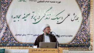 سپس آقای افضلی با موضوع «آسیبشناسی الگوی مصرف در پرتو نیایشهای صحیفه سجادیه» سخنرانی نمود و به تبیین اصول حاکم بر الگوی مصرف از منظر صحیفه پرداخت.