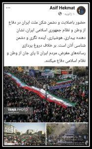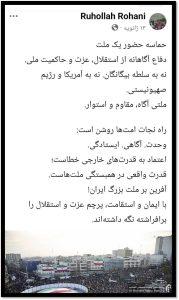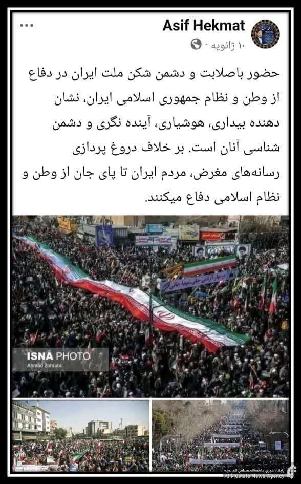 کاربران افغانستانی فضای مجازی همچنین از آگاهی، بصیرت و حضور به موقع و دشمن شکن مردم مسلمان ایران و دفاع جانانه آنا از نظام جمهوری اسلامی ایران ستایش کرده و حضور ده ها میلیونی مردم مقاوم و با درایت ایران، بخصوص در ۲۲ دیماه ستوده اند.