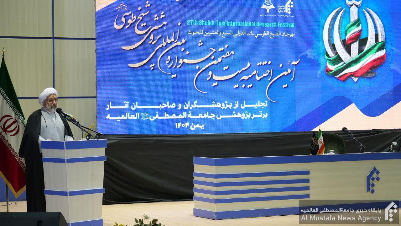 آیت الله عباسی با تبریک اعیاد و مناسبتهای ماه شعبان و دهه فجر انقلاب اسلامی و تقدیر از همه مشارکتکنندگان و دستاندرکاران در برگزاری بیست و هفتمین جشنواره شیخ طوسی، خاطرنشان کرد: این گونه رویدادهای علمی و پژوهشی کارکردهای مختلفی دارد؛ از سویی فرصتی برای ارزیابی فعالیتها و آثار علمی یک مرکز در حوزه های مختلف تالیف، ترجمه و احیای آثار گذشته است و از سوی دیگر فرصتی را جهت فرهنگسازی پژوهشی با ارائه موضوعات کارآمد فراهم می آورد. جشنواره شیخ طوسی نیز همه ساله از پژوهشگران دعوت می نماید پیرامون یک موضوع مهم روز قلم زنند.
