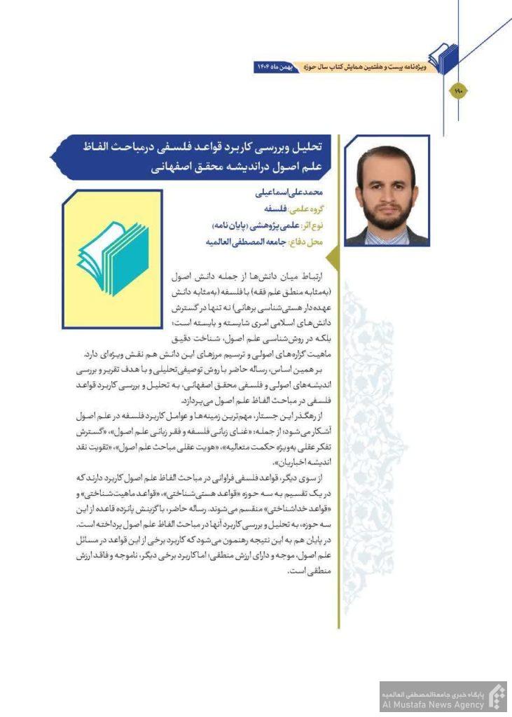 رساله آقای دکتر محمدعلی اسماعیلی با موضوع «تحلیل و بررسی کاربرد قواعد فلسفی در مباحث الفاظ علم اصول در اندیشه محقق اصفهانی» بهعنوان اثر شایسته تحسین در بیست و هفتمین همایش کتاب سال حوزه (بهمن ۱۴۰۴) انتخاب شد.