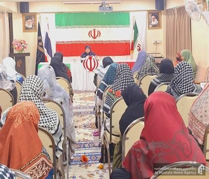 در این مراسم که با حضور استادان و فراگیران و برخی از اقشار مردمی همراه بود خانم زینب ساکی تی شا در سخنانی یاد و خاطره بنیانگذار ج.ا.ا حضرت امام راحل ره را گرامی داشت و نقش بی بدیل رهبری ایشان در پیروزی انقلاب را خاطرنشان کرد و گفت از مهمترین ویژگی های انقلاب اسلامی ایران می توان به عنصر دینی و فرهنگی بودن و استکبار ستیزی آن اشاره کرد که لرزه بر اندام نظام سلطه جهانی انداخت. وی عنصر اتحاد ملت ایران حول محور ولایت فقیه را در به ثمر نشستن انقلاب اسلامی، تعیین کننده دانست.
