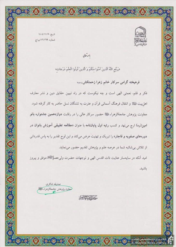 در بخش پایاننامه سطح ۳ سرکار خانم زهرا زحمتکش با پایاننامه «مطالعه تطبیقی آموزش بانوان در دورههای صفویه و قاجار» در رشته تاریخ اسلام رتبه اول را کسب کرد.