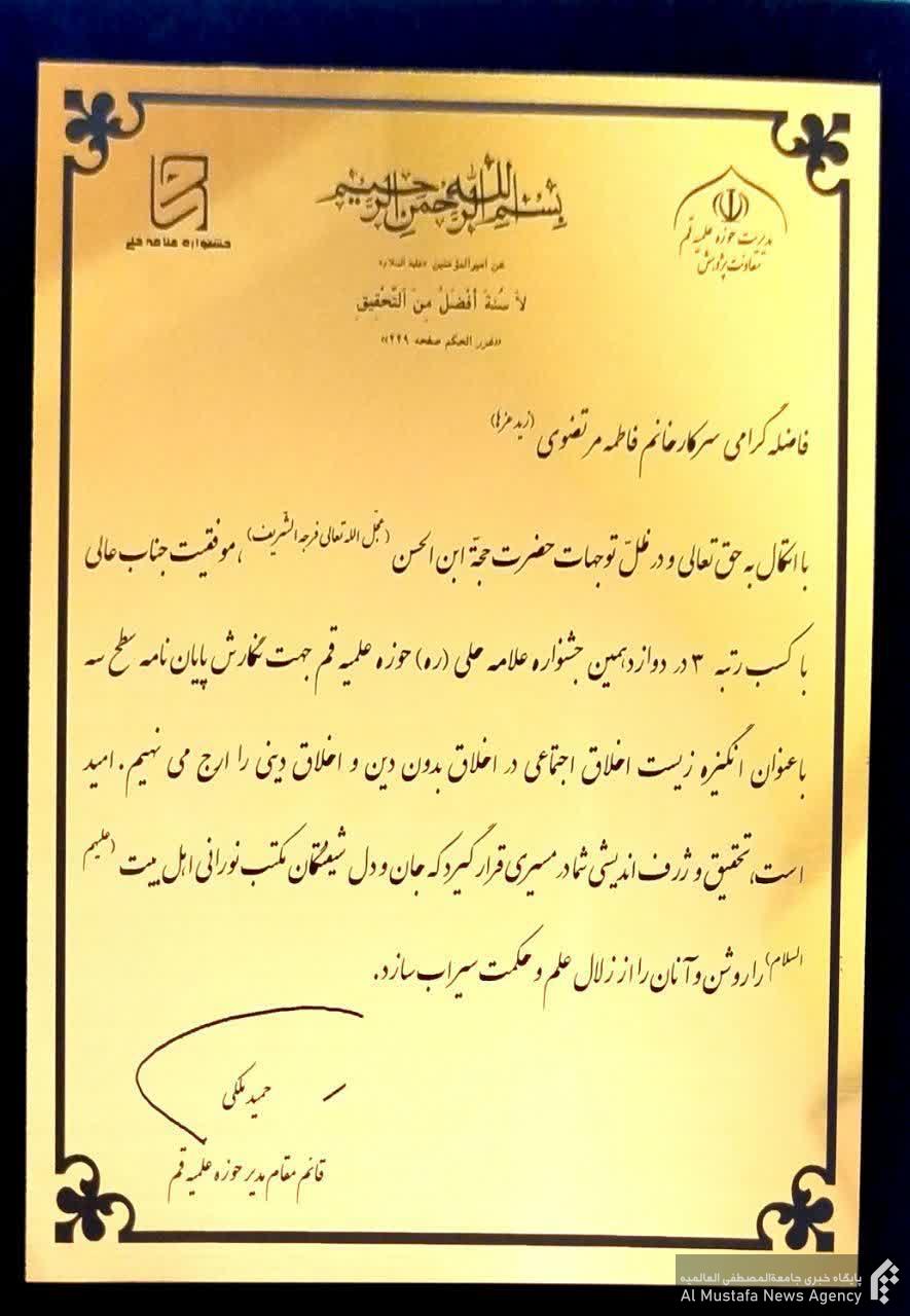 اثر سرکار خانم دکتر نرجس رودگر، دانشیار گروه فلسفه اسلامی جامعهالمصطفی العالمیه و سردبیر دوفصلنامه علمیپژوهشی مطالعات اسلامی زنان و خانواده پژوهشگاه مطالعات اسلامی با عنوان «تطابق عوالم» ، کتاب خانم حمیده تابعی، مدرس و پژوهشگر مجتمع آموزش عالی بنت الهدی با عنوان «مجلسیات (راهنمای کاربردی تبلیغ در جلسات خانگی)» پایان نامه خانم فاطمه مرتضوی عضو گروه فلسفه و عرفان اسلامی با عنوان «انگیزه زیست اخلاق اجتماعی در اخلاق بدون دین و اخلاق دینی» و مقاله خانم دکتر زهرا ضیایی، استادیار گروه رشته کلام اسلامی، با عنوان «مواجهات انتقادی فلسفهٔ سینوی و کلام اشعری در نفسشناسی و تأثیر آن در مسئلهٔ معاد» در این جشنواره موفق به کسب رتبه شدند.