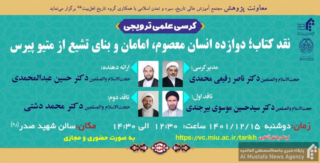 کرسی علمی ترویجی نقد کتاب؛ «دوازده انسان معصوم، امامان و بنای تشیع» اثر متیو پیرس با ارائه حجت الاسلام والمسلمین حسین عبدالمحمدی و به همت معاونت پژوهش مجتمع آموزش عالی تاریخ، سیره و تمدن اسلامی جامعةالمصطفی برگزار میشود.