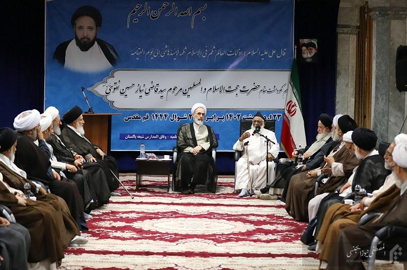 ان کا کہنا تھا کہ میرے لئے یہ اعزاز کی بات ہے کہ تقریباً 30 سال سے شیعہ علماء سے رابطہ میں ہوں اور ان سب میں، پاکستان کی عظمت و بزرگی کو اپنی آنکھوں سے دیکھا ہے۔ ان کا مذہبی جوش و جذبہ امت اسلامیہ کی تحریک اور عالم اسلام کے بہتر مستقبل کیلئے بہت اہمیت رکھتا ہے۔حوزات علمیہ کے سربراہ کا کہنا تھا کہ پاکستان کی سٹریٹجک اور انتہائی مؤثر پوزیشن کے ادراک کیلئے پاکستان میں مزید اہم اقدامات کرنے کی ضرورت ہے۔ ہمیں اس طرح کے ہزاروں علماء کی ضرورت ہے کہ جو پاکستان کے خطے خطے میں پھیل کر مکتب جعفریہ کی ترویج کریں۔ ہمیں فقہ اور اصول وغیرہ میں متخصص کی تربیت کرنے کی ضرورت ہے کیونکہ مستقبل میں پاکستان کا شیعہ خطہ نہایت مؤثر اور بھرپور وزن کا حامل ہوگا اور اس کیلث ضروری ہے کہ تمام شعبوں میں اس ملک کے علماء موجود ہوں۔ انہوں نے آخر میں کہا کہ سید قاضی نیاز حسین ایران اور پاکستان کے درمیان باہمی رابطہ کا بہترین نمونہ تھے۔ وہ ایک ایسی شخصیت تھے گویا انہوں نے ایران کے اسلامی نظام میں زندگی کا بڑا عرصہ گزارا ہو۔